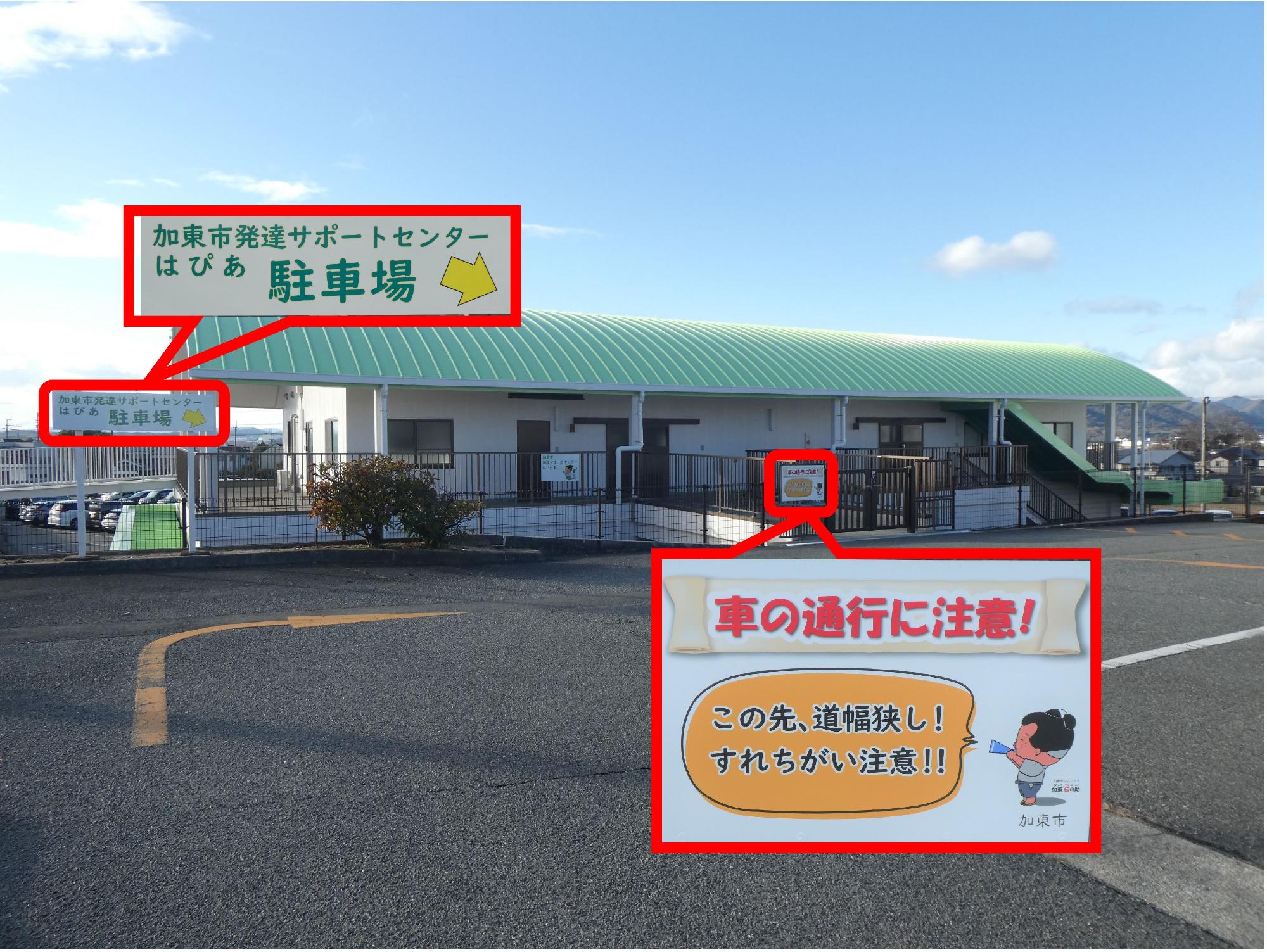 発達サポートセンター「はぴあ」へは、加東市役所北西にある社武道館駐車場に入ってください。