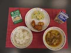 カレーうどん チキンナゲット ポテトサラダのマヨあえ げんりょうこくとうパン ぎゅうにゅう