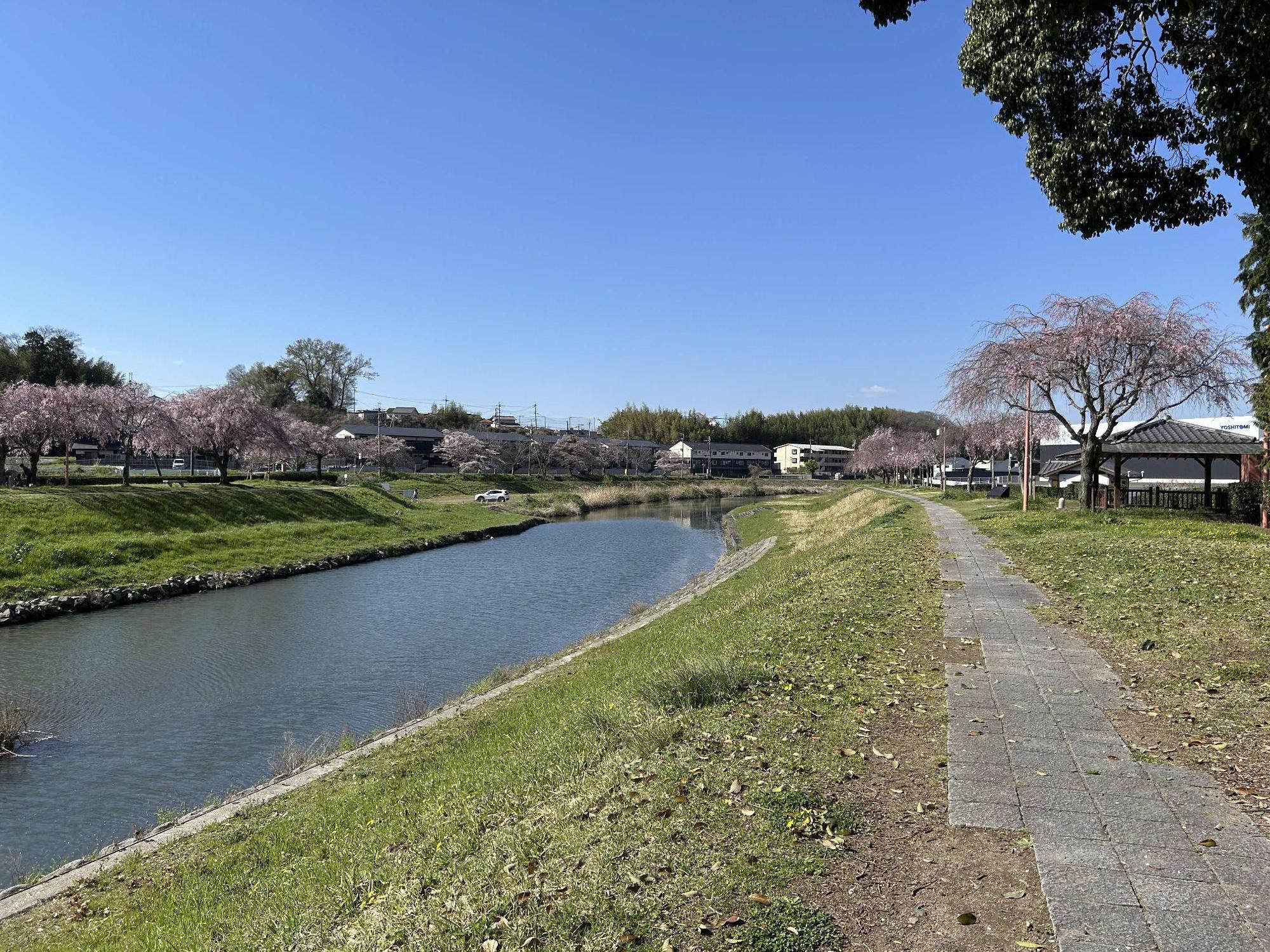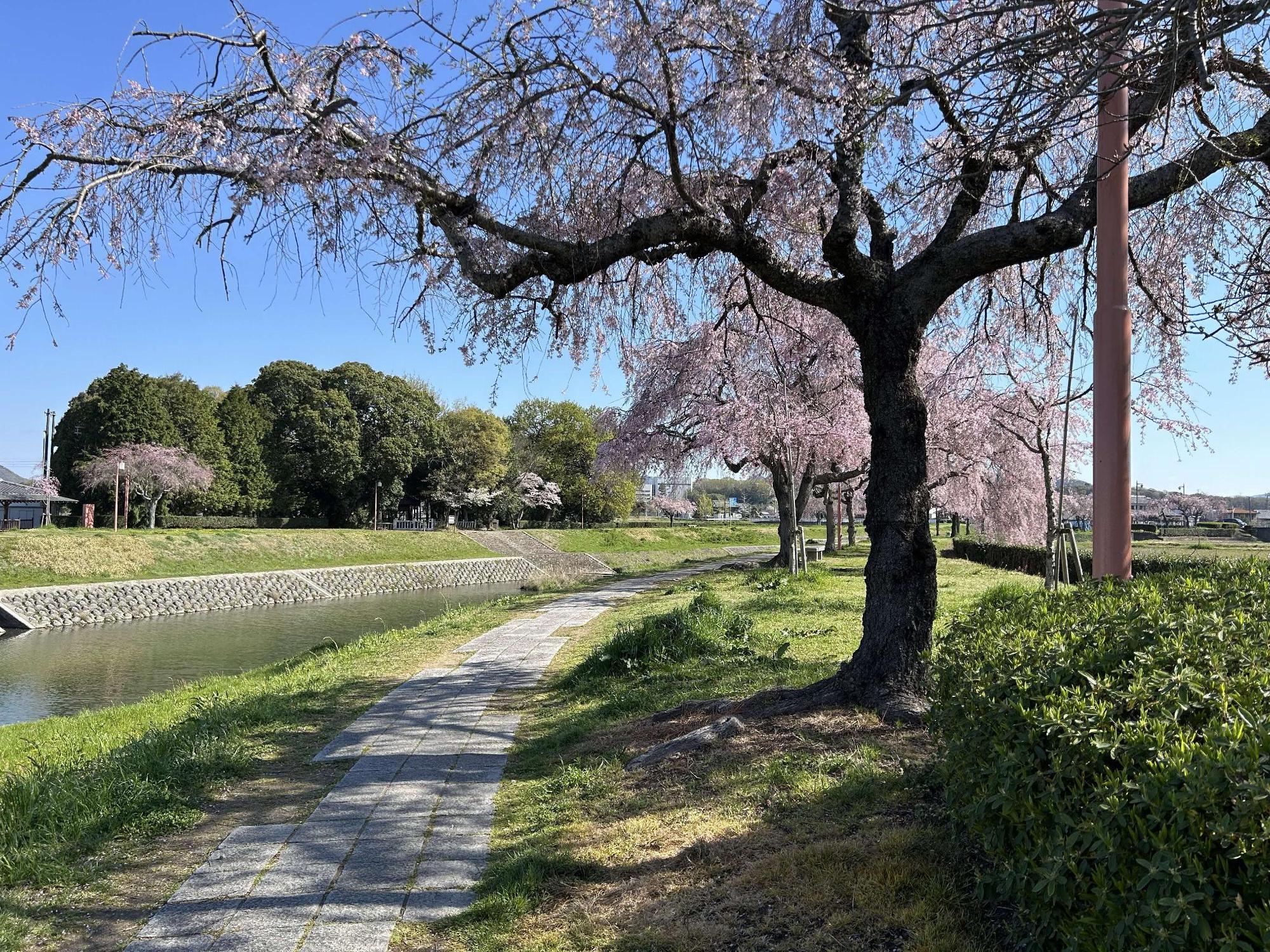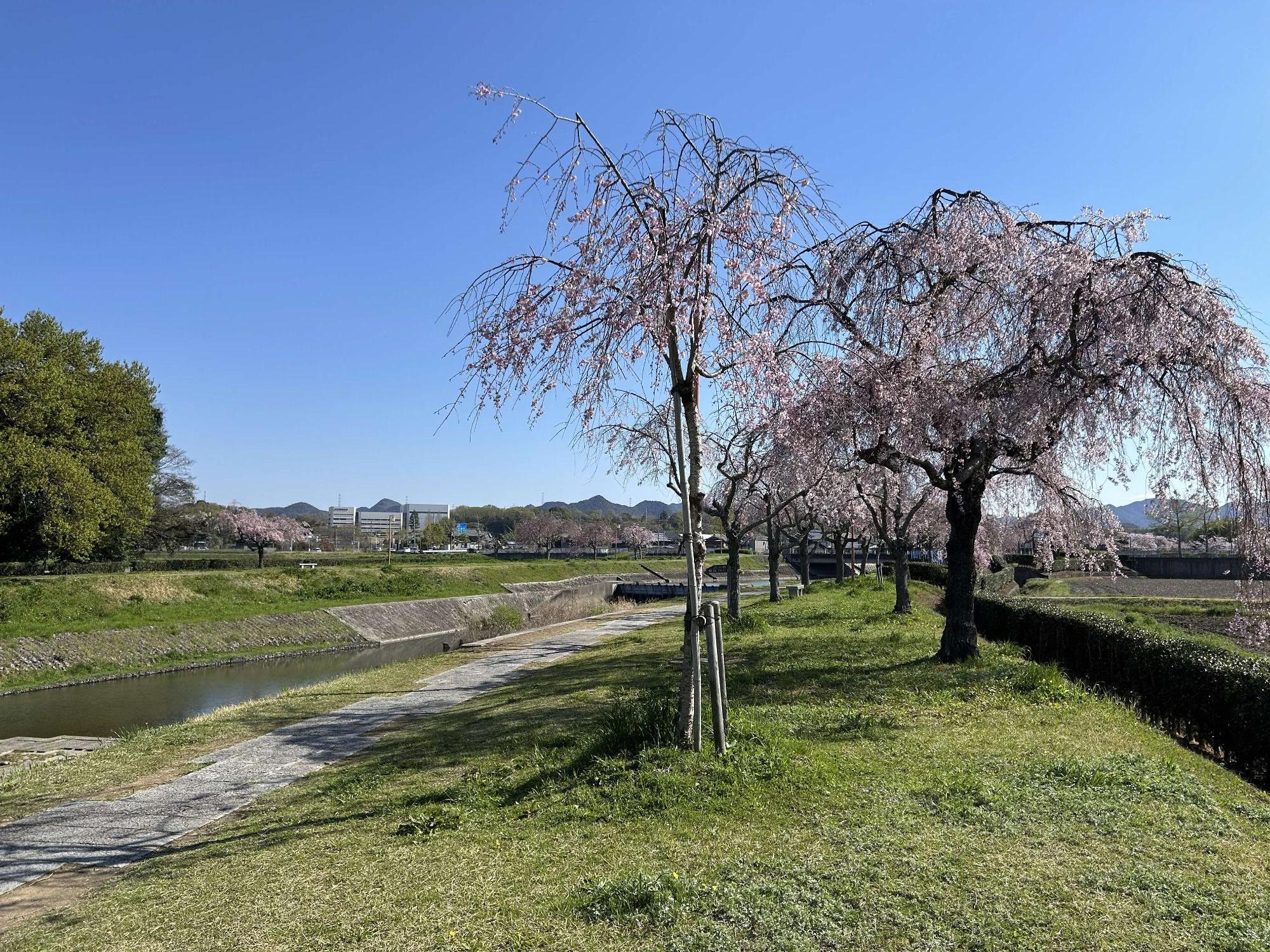 桜の種類は、「紅八重枝垂桜(べにやえしだれざくら)」で、京都嵯峨野にある造園業「植藤造園」の当主で、桜守として知られる佐野藤右衛門氏の指導により、一級河川千鳥川の右岸400m、左岸200mに植栽を行いました。