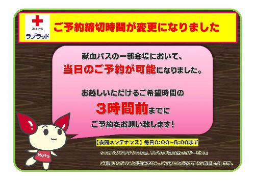 献血予約サイト「ラブラッド」にて献血時間の予約ができます。予約は、献血希望時間の3時間前まで可能となっています。ぜひご活用ください。