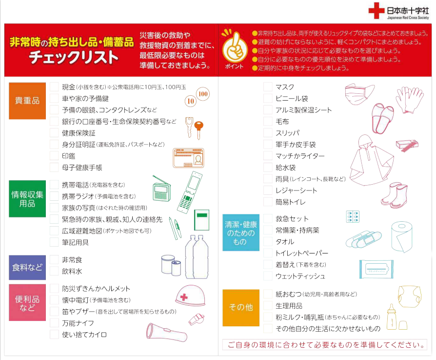 - いざというときに備えて非常持出品の点検をしておきましょう。非常持出品リストは下記をご覧ください。