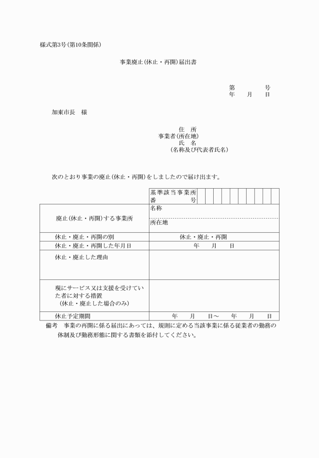 2 基準該当サービス事業者は、当該事業を廃止、休止又は再開する場合には、当該登録を受けた市に対し事業廃止(休止・再開)届出書(様式第3号)を提出するものとする。