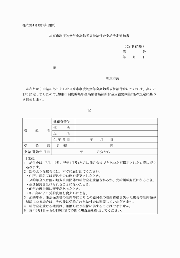 ○加東市制度的無年金高齢者福祉給付金支給要綱