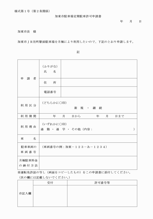 第1条 この規則は、加東市駐車場条例(平成24年加東市条例第23号。以下「条例」という。)の施行に関し、必要な事項を定めるものとする。