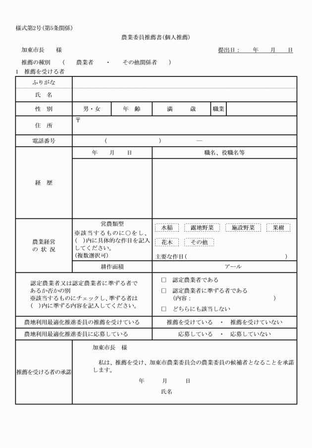 (3) その他推薦のうち農業者が組織する団体以外の者からの推薦 農業者その他関係者2人以上が推薦人となり、農業委員推薦書(個人推薦)(様式第2号)に必要事項を記載し、推薦するものとする。