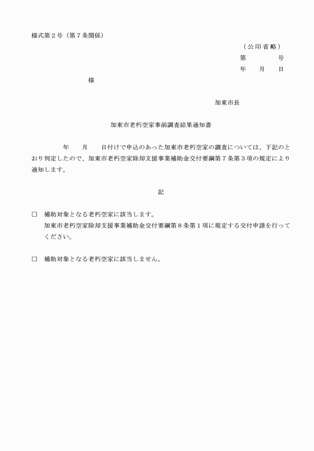 2 市長は、前項の申込書の提出があったときは、その内容を審査し、当該空家に対して立入調査を実施するものとする。