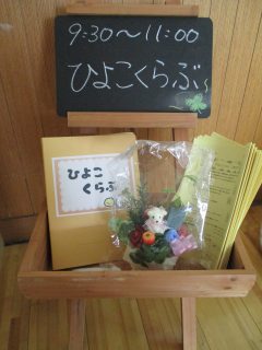 今年度のひよこくらぶは0~3歳のお友達19人でスタートしました。 9:30~11:00という短い時間ですが、幼稚園のお友達と同じようにお便りファイルにシールを貼ったり、お歌を歌ったり体操をします。 みんな戸惑いながらも、先生やお家の方のまねっこをしています。 この、看板を目印にみんな元気よく登園してきています。 |