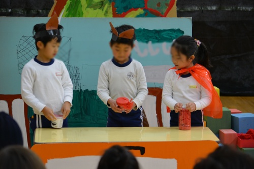 | 待ちに待った発表会本番の日。「どきどきする」 入場前に自分達でめあてを決め本番に臨みました。 一番最初は、「あかずきん」の人形劇をしました。そして自分達で全部準備してから、劇あそびです。 はらぺこオオカミは、森で仲間のオオカミに助けられます。仲間に諭され改心したオオカミと、仲間のオオカミは、森の奥に食べ物を捜しに行きりんごをたくさん収穫します。 たくさん成っているりんごをどうやって取ればいいのか、まだりんごがあるから他の食べ方はないものかとオオカミたちは考えました。猟師さんに教えられ高い山の上まで猟師のおじいちゃんに会いに行きました。 ![]() 力を合わせて山登りをして「やっほ~!」 あかずきんにキッチンを貸してもらう時には、食べてしまったことを謝り、一緒に料理をしようと誘います。 「ごめんね、もう食べないよ」「お願いがあるんだ」山でおじいちゃんに教えてもらったりんごジャムや、やきりんごやアップルパイも教えあって一緒に作りました。 ♪りんごを洗って、細かく切って、おなべに入れて砂糖を入れる。ぐつぐつ煮込んで焦げないように、美味しいりんごジャムできあがり、やった~! 「おいしい」「あまい」「ごちそうさまでした」「まだジャムが残っているよ」「ねえ、教えてもらった人に届けない?」「いいね」 「おじいちゃんに届けるよ」「猟師さん」そして「あかずきんちゃんのおばあちゃん!」 「りんごジャムの作り方を教えてくれてありがとう」「森のこと教えてくれてありがとう」 「おばあちゃん、食べちゃってごめんね、りんごジャムを作ったから食べて」 心優しくなったオオカミは、りんごの木にもお礼を言いました。 ♪みんなでいっしょにつくったよ。 りんごじゃむ、やきりんご、アップルパイ とどけよう とどけよう りんごのきさん、ありがとう 保育室に戻ってきた子ども達は満面の笑顔。めあてを持って、自分達の力を存分に発揮し、最後までがんばりました。 お客様方みなさんの温かいまなざしに見守られたこと、たくさんの拍手をいただいたことに感謝いたします。 ありがとうございました。 |