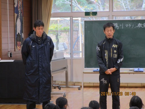 ![]() ![]() ![]() ![]() 本校のOBの藤井和章さんと東谷文彰さんから「走りの心得」を学びました。腕の振りや脚の上げ、インターバル走等の技術的な指導とともに、あきらめずに前に進む気持ちのもち方を教えてもらいました。今、業間かけ足に取り組んでいますが、今日のマラソン教室で聞いたことや知ったことを明日からの練習に活かし、12月のマラソン大会で前へ前へと進む熱い走りを見せてくれることでしょう。 |