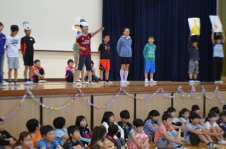 6年生は学校行事を劇で伝えました。 みんなで「妖怪体操第一」も踊りました。 |